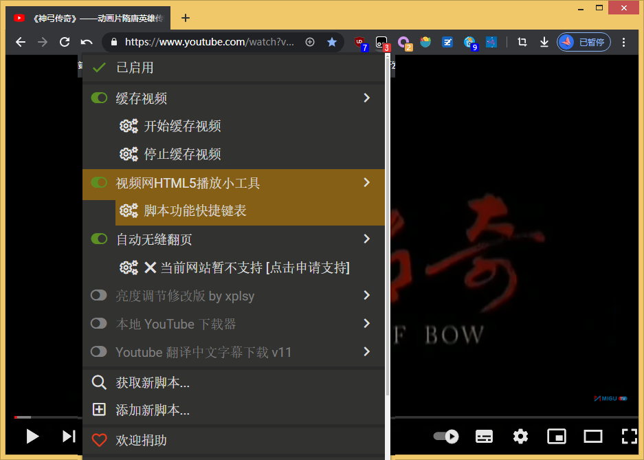 YouTube 进度条变成这样了,底下的按钮都点不到,只能拖进度条……关闭脚本后恢复正常。