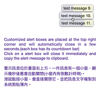 Customized alert boxes are placed at the top right corner and will automatically close in a few seconds.(each box has its countdown bar) Click on a alert box will close it immediately and copy the alert message to clipboard.