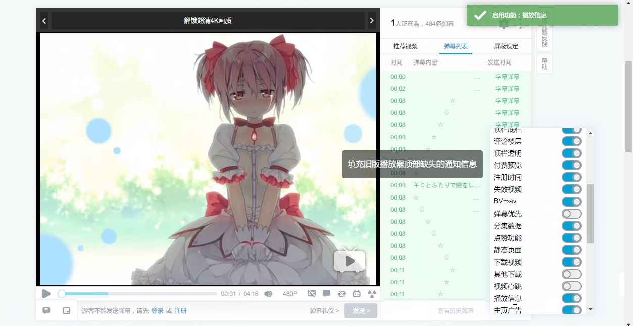 - 可以在设置里启用“播放信息”功能,由于B站后台已不提供数据,所以显示的是脚本本地生成的固定内容。(或者你有什么想显示的我可以添加)
